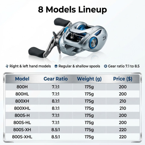 ตัวเลือก: มีให้เลือกทั้งมือขวา/มือซ้าย และอัตราทดเกียร์หลายแบบ (7.1 / 8.1 / 8.5) พร้อมสปูลปกติและสปูลตื้นตามสไตล์การใช้งาน