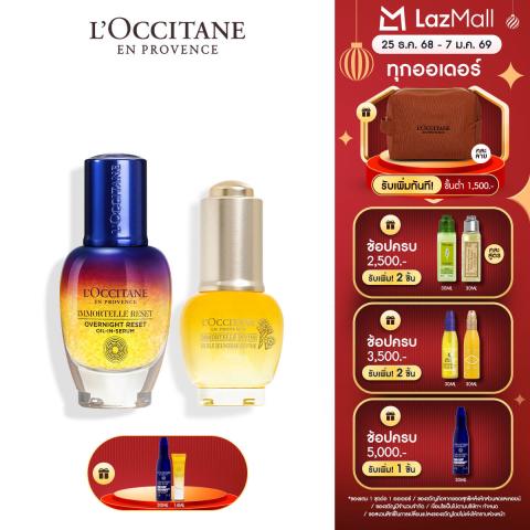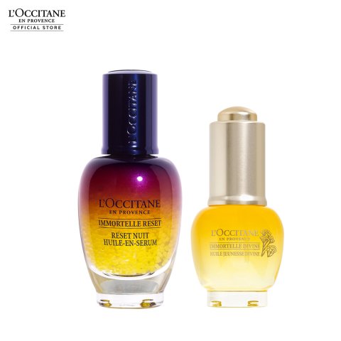 LOccitane Immortelle For Youthful Skin Power Duo Set เซทดูโอ้พรีเซรั่มและออยล์บำรุงผิวหน้าเพื่อผิวดูอ่อนเยาว์ ประกอบด้วย Immortelle Reset Oil-in-Serum 30 ml และ Divine Youth Face Oil 15 ml มอบการปรนนิบัติผิวแบบเหนือระดับด้วยพลังของ น้ำมันหอมระเหยอิมมอคแตลออร์แกนิก ผสานสารสกัดจากพฤกษาพรรณหลากชนิด ช่วยรับมือสัญญาณความร่วงโรยและผลกระทบจากมลภาวะ เผยผิวที่ดูเฟิร์ม กระชับ เปล่งประกาย ดูสดใสกว่าที่เคย