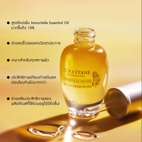 เซรั่มเนื้อใสผสานออยล์ ซึมแนบผิวอย่างอ่อนโยน พร้อม “แคปซูลสีเหลืองทอง” ที่บรรจุน้ำมันหอมระเหยอิมมอคแตล เพื่อช่วยฟื้นบำรุงผิวให้ดูสดใสและเรียบเนียนDivine Youth Face Oil (15 ml)