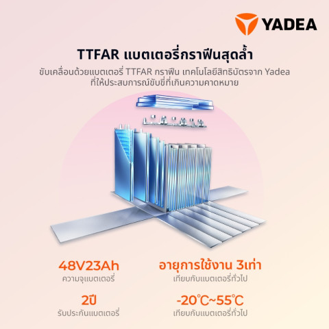 แบตเตอรี่กราฟีน TTFAR 48V 23Ah ลิขสิทธิ์เฉพาะ Yadea อายุการใช้งานยาวนานกว่าปกติถึง 3 เท่า วิ่งได้สูงสุดราว 65 กม.* ต่อการชาร์จหนึ่งครั้ง