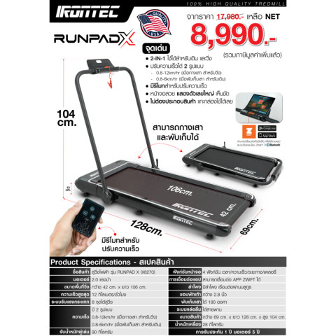 ลู่วิ่งไฟฟ้า IRONTEC RUNPAD X (X8270) ลู่วิ่งรุ่นใหม่ดีไซน์สวย ใช้งานง่ายแบบ 2-IN-1 จะเดินชิล ๆ หรือวิ่งจริงจังก็เอาอยู่ ปรับความเร็วได้ 2 โหมดตามการกาง/พับเสา มาพร้อมรีโมทและหน้าจอเลขใหญ่คมชัด ที่สำคัญคือ ไม่ต้องประกอบ แกะกล่องแล้วใช้งานได้ทันที เหมาะมากสำหรับคอนโด/บ้านที่ต้องการเครื่องออกกำลังกายแบบประหยัดพื้นที่