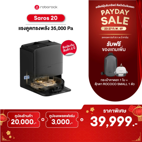 [NEW 2026] Roborock Saros 20 เครื่องดูดฝุ่นอัจฉริยะพร้อมระบบถูพื้นในเครื่องเดียว ตอบโจทย์บ้านยุคใหม่ที่ต้องการความสะอาดแบบล้ำลึกและประหยัดเวลา ด้วยแรงดูดทรงพลังสูงสุด 35,000 Pa เก็บฝุ่นผง เส้นผม และเศษสิ่งสกปรกได้อย่างมีประสิทธิภาพทั้งบนพื้นแข็งและพรม พร้อมไฮไลต์เด่นอย่างการ ซักม็อบด้วยอุณหภูมิสูงสุด 100°C เพื่อช่วยลดคราบฝังแน่นและเพิ่มความมั่นใจเรื่องความสะอาดในทุกวัน