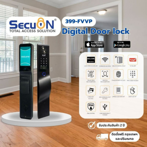SECUON ดิจิตอลล็อค SEC-399 FVVP (FACESCAN) สีดำ ยกระดับความปลอดภัยและความสะดวกสบายให้บ้าน/คอนโด/ออฟฟิศ ด้วยระบบปลดล็อคอัจฉริยะครบครันถึง 7 วิธี พร้อม Wi-Fi Build-in และควบคุมผ่านแอป Tuya บนมือถือ เข้า-ออกได้คล่องตัว ปลอดภัยยิ่งขึ้นด้วยรหัสผ่านแบบใช้ครั้งเดียว (One Time Password) เหมาะสำหรับทั้งการอยู่อาศัยและห้องเช่า