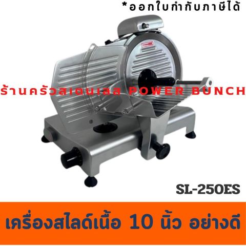 เครื่องสไลด์เนื้อ 10 นิ้ว Meat Slicer รุ่น SL-250ES ราคา 9,500.00 บาท เหมาะสำหรับร้านชาบู ร้านหมูกระทะ ร้านอาหาร และงานเชิงพาณิชย์ที่ต้องการสไลด์เนื้อให้ได้แผ่นบางสวย สม่ำเสมอ ใช้งานง่าย แข็งแรง และปลอดภัย พร้อมฟังก์ชันครบเพื่อการใช้งานจริงในร้าน