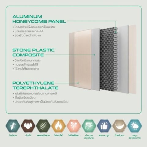 วัสดุหลัก: อลูมิเนียมโครงสร้างรังผึ้ง, Stone Plastic Composite, ฟิล์ม PET
