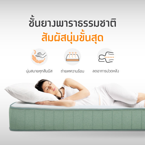 ภายในเสริมชั้นยางพาราธรรมชาติแท้ ช่วยรองรับสรีระได้อย่างเป็นธรรมชาติ รองรับน้ำหนักได้อย่างทั่วถึงตั้งแต่ศีรษะไปจนถึงสะโพกและขา ลดแรงกดทับในจุดสำคัญ ช่วยให้การไหลเวียนของเลือดดีขึ้น และลดอาการปวดหลัง ปวดเอว และสะโพกจากการนอนผิดท่า นอกจากนี้ยังมีการออกแบบให้มีรูระบายอากาศบนชั้นยางพารา ช่วยให้ที่นอนไม่อับชื้น ระบายความร้อนได้ดี เหมาะสำหรับสภาพอากาศร้อนชื้นแบบเมืองไทย