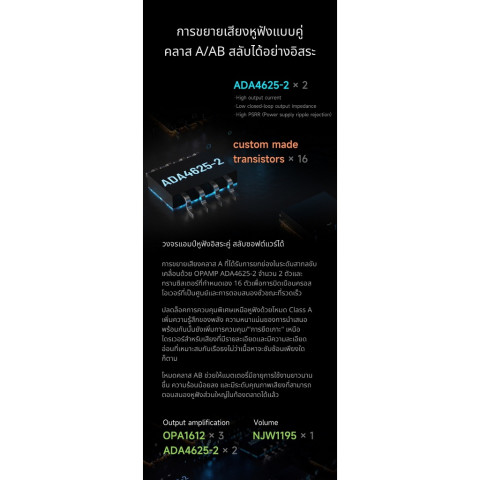 ภาคขยายหูฟังคู่ Class A / Class AB สลับโหมดได้ผ่านซอฟต์แวร์ ปรับคาแรกเตอร์เสียงและความประหยัดพลังงานตามสไตล์การฟัง
