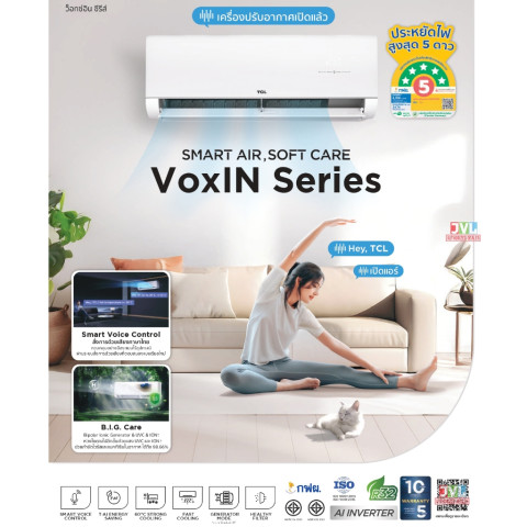 ส่งทั่วไทย TCL แอร์ รุ่น VoxIN SERIES แอร์ติดผนังอินเวอร์เตอร์ รุ่นใหม่ล่าสุดปี 2025 ทำงานเต็ม BTU ประหยัดไฟ “เบอร์ 5 สูงสุด 5 ดาว*” พร้อมฟังก์ชัน สั่งงานด้วยเสียง (รองรับภาษาไทย) เย็นไว คุมอุณหภูมินิ่ง เหมาะทั้งบ้าน คอนโด และออฟฟิศ