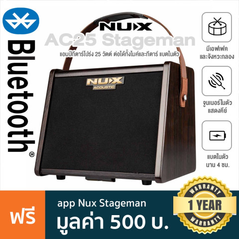 NUX® AC-25 แอมป์กีตาร์โปร่งกำลังขับ 25 วัตต์ ที่ออกแบบมาเพื่อสายเล่นนอกสถานที่และงานเล็ก ๆ โดยเฉพาะ มาพร้อมเทคโนโลยี Amp Modeling (Stageman/L Box) ให้โทนเสียงอะคูสติกเป็นธรรมชาติ ใช้งานสะดวกด้วยแบตเตอรี่ในตัว พกพาไปซ้อม/เล่นข้างนอกได้ทันที แถมยังต่อได้ทั้ง กีตาร์ + ไมโครโฟน ในเครื่องเดียว พร้อม Bluetooth สำหรับเปิดแบ็คกิ้งแทร็กหรือเพลงประกอบ และเอฟเฟค Reverb ที่ช่วยเติมมิติให้เสียงฟังนุ่มลึกยิ่งขึ้น