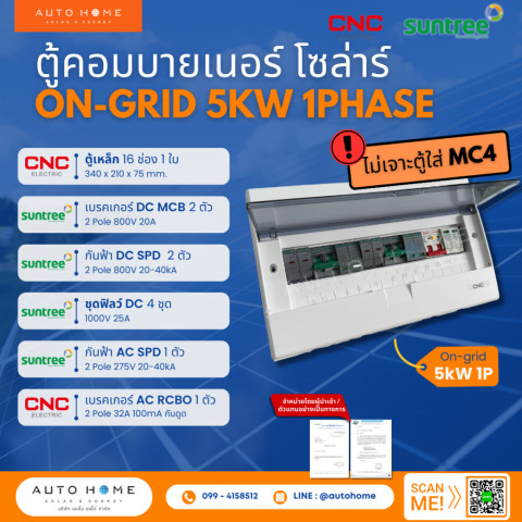 ตู้โซล่าออนกริด 3-5kW 1เฟส 1สตริง รับ 800VDC พร้อม RCBO ผ่าน PEA/MEA (อุปกรณ์แท้ Suntree & CNC & LINK)