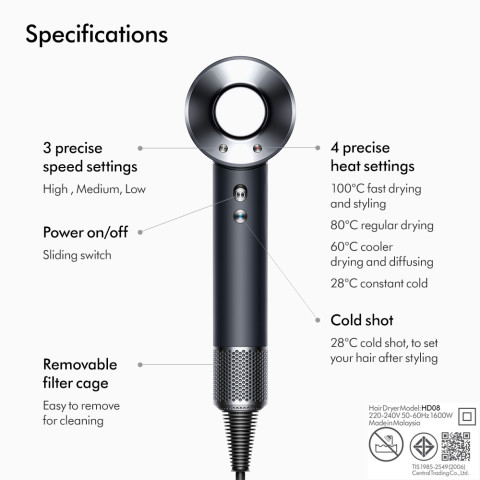 Dyson Supersonic™ Origin hair dryer Black/Nickel ไดร์เป่าผมสีดำดีไซน์พรีเมียม ที่ยกระดับการเป่าผมให้ “แห้งไว เรียบสวย และผมชี้ฟูน้อยลง” ด้วยเทคโนโลยีควบคุมความร้อนอัจฉริยะและมอเตอร์ดิจิทัลความเร็วสูง ช่วยถนอมเส้นผม เหมาะทั้งวันเร่งรีบและวันที่ต้องการจัดทรงแบบเนี้ยบ ๆ