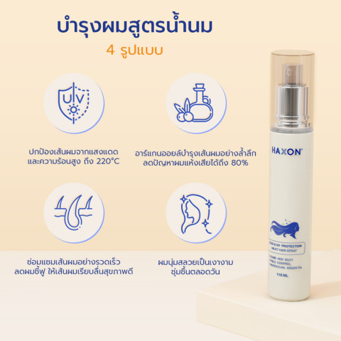 Haxon Heat Protection Milky Hair Spray สเปรย์น้ำนมกันความร้อนและจัดแต่งทรงผม กลิ่นหอมน้ำนมอ่อนๆ ช่วยบำรุงเส้นผมให้ดูนุ่มลื่น ลดความแห้งเสีย พร้อมปกป้องผมจากความร้อนของไดร์ หนีบ และม้วนผม เหมาะสำหรับทุกสภาพผม ใช้งานง่าย ฉีดแล้วผมไม่แข็งกระด้าง และมอบความหอมติดผมยาวนานตลอดวัน
