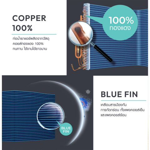 Anti-Corrosion + Blue Fin เคลือบสารป้องกันการกัดกร่อนทั้งคอยล์เย็นและคอยล์ร้อน เพิ่มความทนทาน เหมาะกับสภาพอากาศชื้น