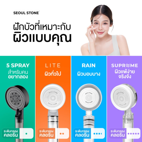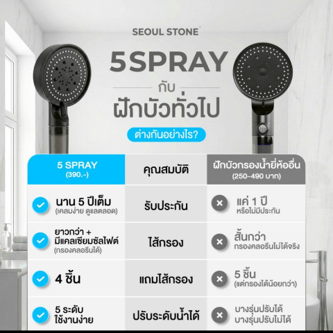 ฝักบัวกรองน้ำ Seoul Stone 5 Spray ตัวช่วยยกระดับการอาบน้ำให้สะอาด นุ่มสบายผิว พร้อมรับฟรีไส้กรองฝักบัว 4 ชิ้น ตั้งแต่วันแรกที่ใช้งาน ช่วยกรองสิ่งสกปรกและคลอรีนที่มากับน้ำ ลดกลิ่นไม่พึงประสงค์ พร้อมสัมผัสสายน้ำนุ่มละมุนเหมือนทำสปาที่บ้านทุกวัน ในราคา 391.60 บาท และมั่นใจยิ่งขึ้นด้วย รับประกันสินค้า 5 ปี
