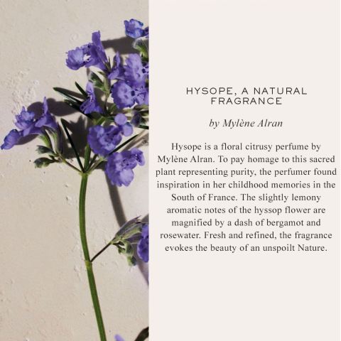 น้ำหอมจากคอลเลคชั่น Atelier des Fleurs ที่เปิดโอกาสให้คนรักน้ำหอมสร้าง “ช่อดอกไม้แห่งกลิ่น” ในแบบของตัวเอง สามารถเลเยอร์ร่วมกับกลิ่นอื่นในคอลเลคชั่นเพื่อรังสรรค์ซิกเนเจอร์เฉพาะตัวได้อย่างไร้ขีดจำกัด โดยกลิ่น Hysope ถูกปรุงโดยมาสเตอร์เพอร์ฟูมเมอร์ Mylène Alran ได้แรงบันดาลใจจากความทรงจำวัยเด็กในแคว้นทางตอนใต้ของฝรั่งเศส ถ่ายทอดความงามของธรรมชาติอันบริสุทธิ์ได้อย่างสดชื่นและละเมียดละไม