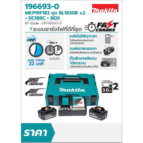 รุ่น MKP1RF182: แบตเตอรี่ 18V ความจุ 3.0Ah จำนวน 2 ก้อน + แท่นชาร์จเร็ว DC18RC 1 ชิ้น