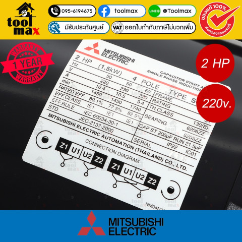 MITSUBISHI มอเตอร์มิตซู รุ่น SCL-QR (Super Line Q Series) ขนาด 2 แรงม้า มอเตอร์เหนี่ยวนำคุณภาพสูงสำหรับงานอุตสาหกรรมและงานระบบ ที่ต้องการแรงบิดดี รอบนิ่ง และความทนทานยาวนาน ใช้งานกับไฟบ้าน 220V 1 เฟส (2 สาย) พร้อมระบบ Capacitor Start ช่วยให้ออกตัวได้มั่นใจ เหมาะสำหรับงานพัดลมระบายอากาศ ปั๊มน้ำ สายพานลำเลียง และงานคอมเพรสเซอร์