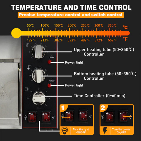 มือจับประตูเตาอบทำจากสแตนเลสหนา ป้องกันความร้อน ช่วยให้เปิดปิดได้อย่างมั่นใจ ไม่ร้อนมือ แม้ในขณะใช้งานต่อเนื่อง ภายในห้องอบออกแบบให้กระจายความร้อนแบบสามมิติ ช่วยให้พิซซ่าสุกทั่วถึงทั้งด้านบนและด้านล่าง พร้อมระบบควบคุมอุณหภูมิของท่อทำความร้อนบน–ล่างแบบอิสระ ทำให้คุณกำหนดความกรอบและสีของพิซซ่าได้ตามต้องการ