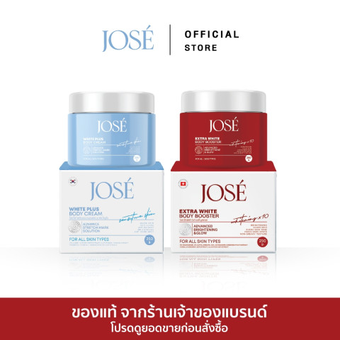 สัมผัสผิวกายกระจ่างใส นุ่มเด้ง มีออร่าแบบจัดเต็ม ด้วยเซตบำรุงผิวสุดคุ้ม [บริษัทโดยตรง] โปรคู่ JOSE White Plus Body Cream 1 กระปุก และ JOSE Extra White Body Booster 1 กระปุก ขนาดกระปุกละ 250 กรัม รวม 2 สูตรฮิตในเซตเดียว ตอบโจทย์ทั้งบำรุงล้ำลึกและเร่งผิวดูกระจ่างใสอย่างเป็นธรรมชาติ เหมาะสำหรับผู้ที่ต้องการดูแลผิวกายเป็นพิเศษในทุกวัน