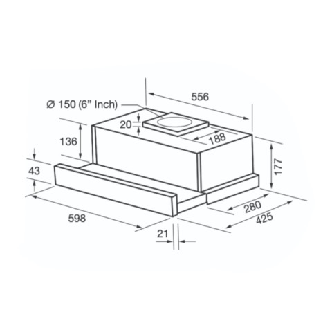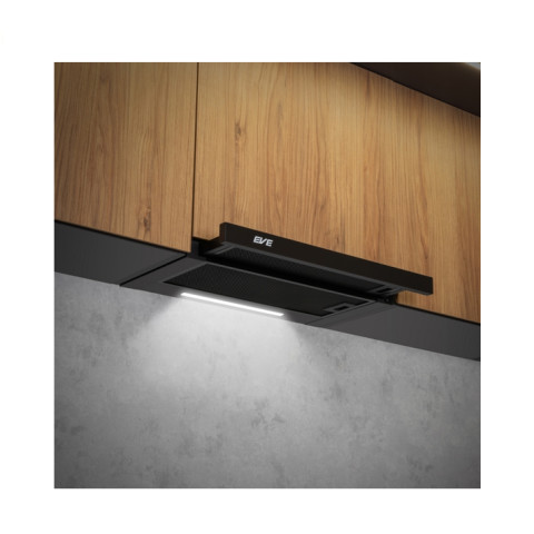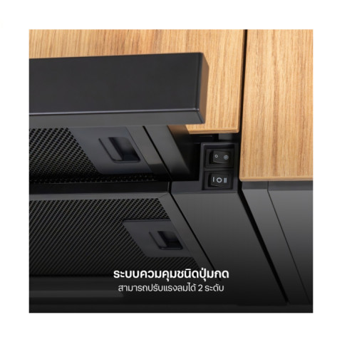 เครื่องดูดควันชนิดฝังใต้ตู้เฟอร์นิเจอร์แบบรางเลื่อน ขนาดกว้าง 60 ซม. ตัวโครงเครื่องอบสีดำกลมกลืนกับเฟอร์นิเจอร์ครัวสมัยใหม่ ให้ความสวยเรียบเนียนไม่เกะกะสายตา พร้อมกำลังดูดสูงสุด 950 ลบ.ม./ชม. ช่วยดูดควัน กลิ่น และไอน้ำมันจากการทำอาหารได้อย่างรวดเร็ว ลดคราบมันเกาะผนังและตู้ให้ทำความสะอาดง่ายขึ้น รองรับได้ทั้งครัวขนาดเล็กและกลาง