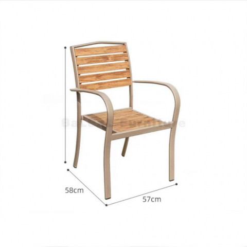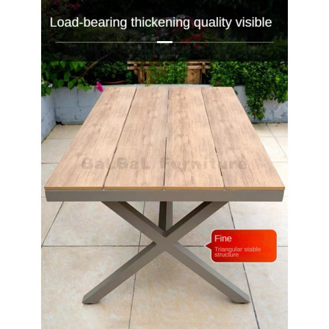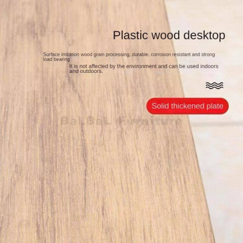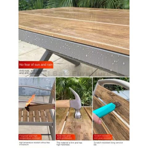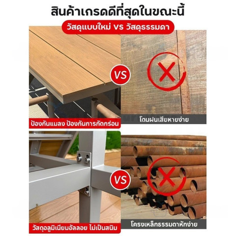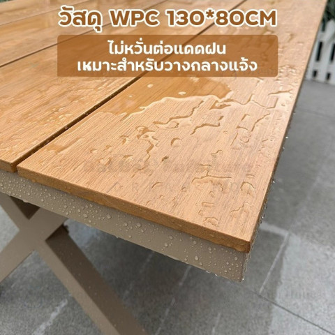 โครงสร้างโต๊ะผลิตจากอลูมิเนียมคุณภาพสูง น้ำหนักเบาแต่แข็งแรง ทนทานต่อการใช้งานกลางแจ้ง ไม่เป็นสนิมง่ายเหมือนโครงเหล็ก จึงดูแลรักษาง่ายและมีอายุการใช้งานยาวนาน ส่วนพื้นผิวโต๊ะเป็นโพลีสไตรีนลายไม้สีเทา ให้สัมผัสและลุคคล้ายไม้จริง แต่ทำความสะอาดง่ายและทนต่อสภาพอากาศ เหมาะกับการตั้งไว้กลางแจ้งทั้งลานบ้าน ระเบียง สวน หรือพื้นที่พักผ่อนนอกบ้าน