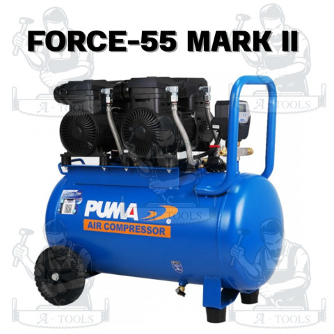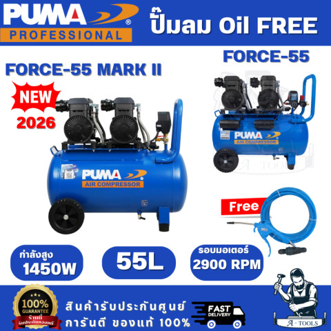PUMA FORCE ปั๊มลม ออยฟรี 55 ลิตร รุ่น FORCE-55 / FORCE-55 MARK II กำลังไฟรวม 2900W ปั๊มลมไร้น้ำมันเสียงเงียบ มอเตอร์ทองแดงแท้ ทนทาน ใช้งานยาวนาน เหมาะสำหรับงานที่ต้องการลมสะอาด ปราศจากน้ำมัน เช่น งานช่าง งานเฟอร์นิเจอร์ งานพ่นสี หรืองานภายในอาคารที่ต้องการลดเสียงรบกวน