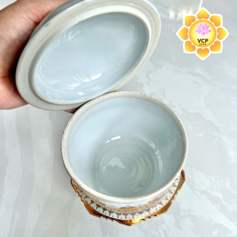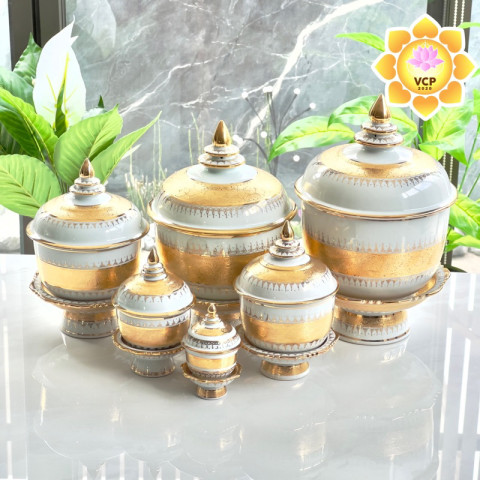 ชุดนี้เป็นแบบ โถ 7 นิ้ว + พานรอง 7 นิ้ว ผลิตจากเซรามิคอย่างดี พื้นผิวเคลือบเงา ลงเส้นลายไทยสีน้ำทองและผิวทองอย่างละเอียดทุกจุด ให้ความรู้สึกหรูหรา มีระดับ และโดดเด่นเมื่อวางคู่กับพระพุทธรูป โต๊ะหมู่บูชา หรือโกศใส่กระดูก