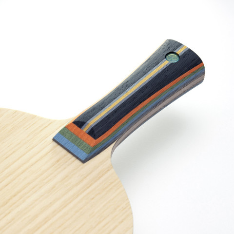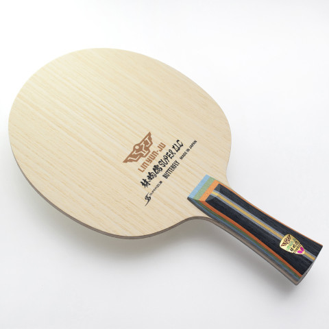 ดีไซน์ด้ามจับแบบ AN (Anatomic) โค้งรับกับสรีระฝ่ามือ ให้ความรู้สึกกระชับเป็นธรรมชาติ ถือได้มั่นคงทั้งจังหวะบุกและรับ ตกแต่งด้วยสีสันสวยงามที่ Lin Yun-Ju ชื่นชอบ พร้อมโลโก้ปีกผีเสื้อและอักษรย่อของเขา สื่อถึงความอ่อนเยาว์ พลัง และเส้นทางสู่ความสำเร็จในอนาคต