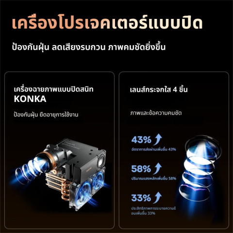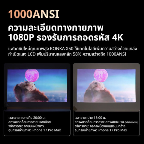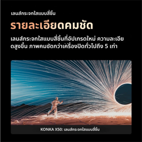 KONKA X50 มาพร้อมความสว่างสูงถึง 1000 ANSI และความละเอียดแท้ Full HD 1080P รองรับการถอดรหัสสัญญาณภาพระดับ 4K ให้สีสันสมจริงมากถึง 16.67 ล้านสี ภาพคมชัดระดับวอลเปเปอร์ แม้เปิดใช้งานในห้องที่มีแสงรบกวน ก็ยังได้ภาพที่คมชัดและมีมิติ สัมผัสประสบการณ์จอยักษ์เหมือนนั่งอยู่ในโรงภาพยนตร์ได้ที่บ้าน