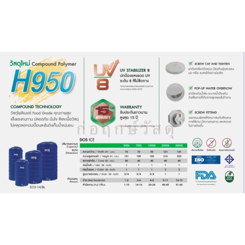 เลือก DOS ICE เพื่อการสำรองน้ำที่สะอาด ปลอดภัย แข็งแรง ทนแดด ไม่เกิดตะไคร่ พร้อมความอุ่นใจด้วยการรับประกันยาวนาน เหมาะกับทุกบ้านที่ต้องการคุณภาพแบบ “ติดตั้งครั้งเดียว ใช้ยาวๆ”