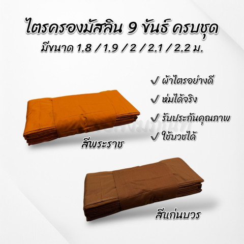 ไตรครองมัสลิน 9 ขันธ์ สังฆาฏิ 2 ชั้น ธรรมยุต ครบชุด ขนาด 2.2 เมตร สีแก่นบวร ในราคาพิเศษเพียง 5,099 บาท เหมาะอย่างยิ่งสำหรับผู้ที่ต้องการจัดเตรียมไตรบวชให้ผู้บวช หรือผู้ศรัทธาที่ต้องการถวายผ้าไตรคุณภาพดีให้พระภิกษุ