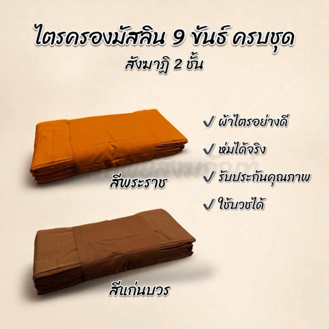 ไตรครองมัสลิน 9 ขันธ์ สังฆาฏิ 2 ชั้น ธรรมยุต ครบชุด ขนาดผ้าห่มได้จริง ใช้บวชได้ รับประกันคุณภาพ เหมาะสำหรับใช้ในพิธีอุปสมบท พิธีกรรมทางศาสนา และการใช้งานในชีวิตประจำวันของพระภิกษุ ออกแบบตามแบบธรรมยุตอย่างถูกต้อง สง่างาม และเรียบร้อยตามพระวินัย