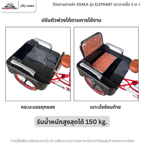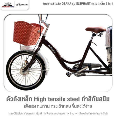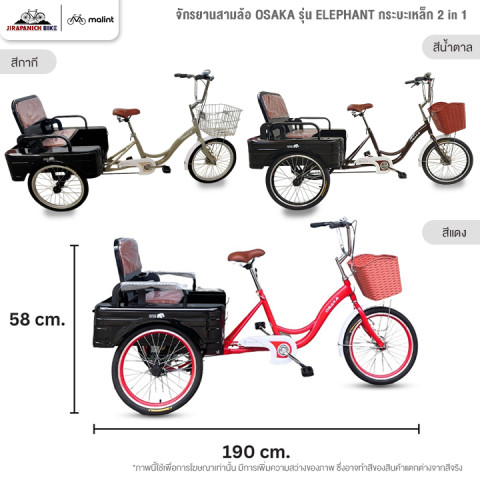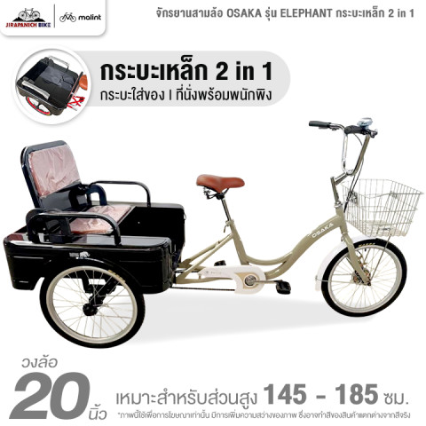 เพิ่มความคล่องตัวในทุกวันของคุณด้วย จักรยานสามล้อ 20 นิ้ว OSAKA รุ่น ELEPHANT กระบะเหล็ก 2 in 1 จักรยานสามล้อสารพัดประโยชน์ที่ทั้ง นั่งสบาย บรรทุกของได้จริง และขี่ง่ายปลอดภัย เหมาะอย่างยิ่งสำหรับผู้สูงอายุ คนทำงาน แม่บ้าน หรือผู้ที่ต้องการพาหนะสำหรับใช้งานในชีวิตประจำวันภายในหมู่บ้าน ตลาด หรือระยะทางใกล้ ๆ