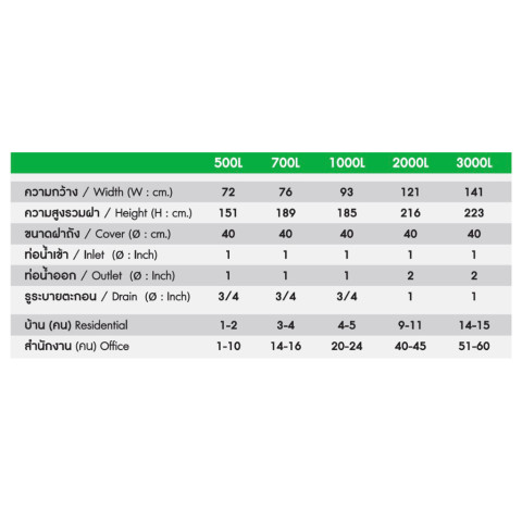 การใช้งานที่แนะนำ: บ้านพักอาศัย, ร้านค้า, ออฟฟิศขนาดเล็ก, โกดัง หรือใช้เป็นถังสำรองน้ำ