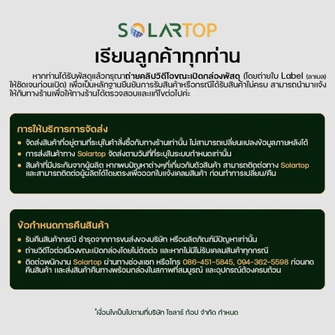 เมื่อได้รับสินค้า กรุณา ตรวจเช็กสภาพสินค้าร่วมกับบริษัทขนส่งทันที หากพบสินค้าชำรุด ให้ถ่ายรูปสินค้าและทะเบียนรถขนส่ง แล้วแจ้งกลับทางร้านเพื่อดำเนินการเคลม