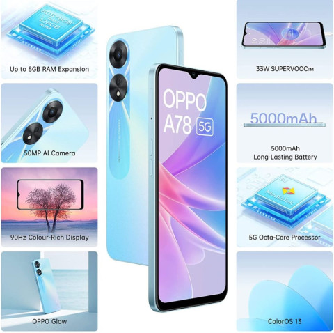 OPPO A78 5G / A17 รุ่นนี้ยังมาพร้อมตัวเลือกสีที่สวยโดดเด่นทั้ง Black และ Blue ให้คุณเลือกสไตล์ที่ตรงกับตัวเอง เหมาะสำหรับผู้ที่มองหาสมาร์ทโฟน 5G หน้าจอใหญ่ แบตอึด กล้องดี ความจุเยอะ ในราคาที่คุ้มค่ามากเป็นพิเศษ