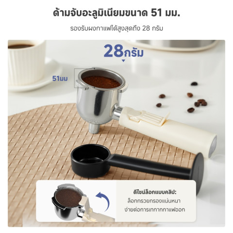 ด้ามจับอะลูมิเนียม 51 มม. + ตะกร้าใหญ่: ล็อกง่าย ใส่กาแฟได้สูงสุด 28 กรัม