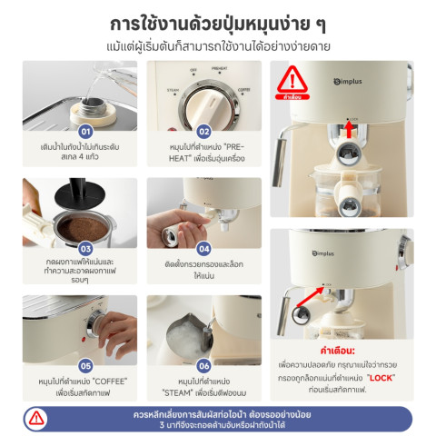 คำเตือน: เพื่อความปลอดภัย กรุณาแน่ใจว่ากรวยกรองถูกล็อกแน่นที่ตำแหน่ง “LOCK” ก่อนเริ่มสกัดกาแฟ