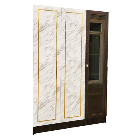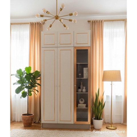 อัปเกรดความหรูให้ห้องนอนด้วยตู้เสื้อผ้ารุ่นใหม่ ดีไซน์โมเดิร์นที่เป็นได้ทั้ง ตู้เสื้อผ้า และ ตู้โชว์ในตัว ขนาดกะทัดรัดช่วยประหยัดพื้นที่ พร้อมหน้าบานโทนครีมตัดขอบ Pink Gold เพิ่มความโดดเด่นแบบพรีเมียม เปิดมุมมองสวยงามด้วย ประตูกระจกใส จัดโชว์ของสะสม/กระเป๋า/น้ำหอมได้ลงตัว