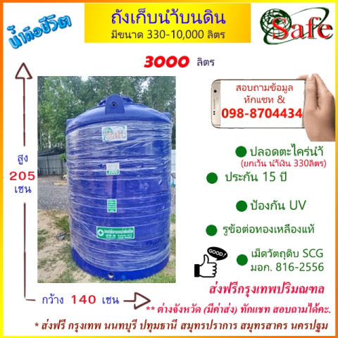 ถังเก็บน้ำบนดิน SAFE สีน้ำเงิน 3000 ลิตร ตัวช่วยสำรองน้ำสำหรับบ้านพักอาศัย หอพัก ร้านค้า หรือโรงงาน พร้อมวัสดุคุณภาพสูง ปลอดภัยสำหรับน้ำอุปโภคบริโภค ใช้งานได้ยาวนาน คุ้มค่าในระยะยาว