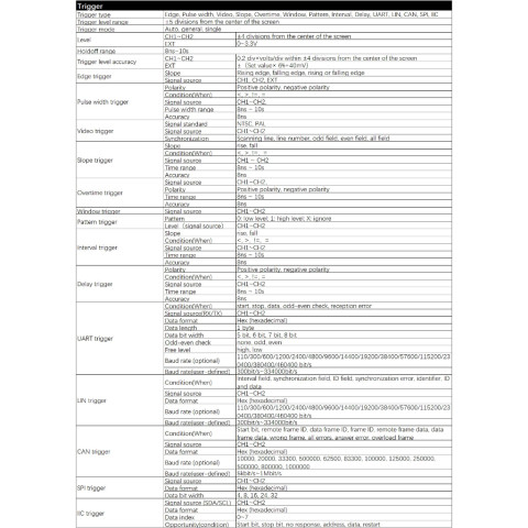 Trigger: EDGE, PULSE, VIDEO, SLOPE, OVERTIME, WINDOW, PATTERN, INTERVAL, DELAY, UART, LIN, CAN, SPI, IIC