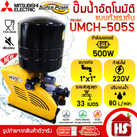 MITSUBISHI ปั้มน้ำออโต้ รุ่น UMCH-505S ปั๊มน้ำอัตโนมัติชนิดหลายใบพัด แบบถังแรงดัน ขนาดท่อ 1x1 นิ้ว กำลังไฟ 500 วัตต์ ใช้งานกับไฟบ้าน 220V ให้น้ำแรงสม่ำเสมอ เหมาะสำหรับบ้านพักอาศัย อาคารพาณิชย์ หรือจุดใช้น้ำหลายจุดพร้อมกัน มั่นใจทั้งความทนทาน ความปลอดภัย และความประหยัดในระยะยาว