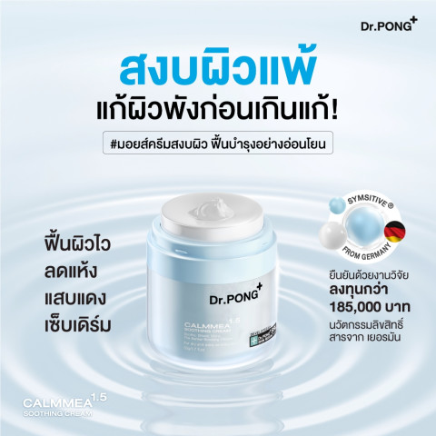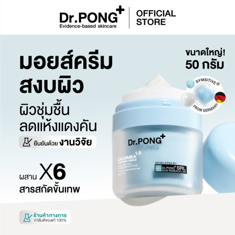 Dr.PONG CalmMEA 1.5 Soothing Cream (50g) มอยส์เจอร์ไรเซอร์เนื้อบางเบา ซึมไว ช่วยเติมความชุ่มชื้นพร้อมปลอบประโลมผิวที่ระคายเคือง ลดอาการแห้ง แดง คัน และผิวอักเสบ เหมาะอย่างยิ่งสำหรับคนผิวบอบบาง แพ้ง่าย ผิวแห้งลอก หรือมีแนวโน้มเป็นเซ็บเดิร์ม ให้ผิวกลับมาดูสงบ เรียบเนียน และแข็งแรงขึ้นอย่างต่อเนื่อง