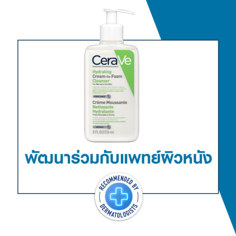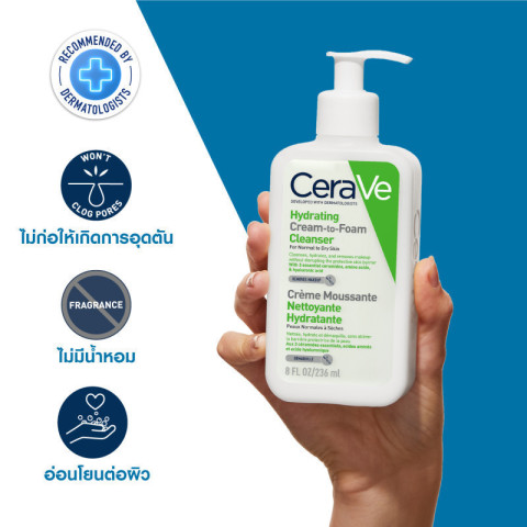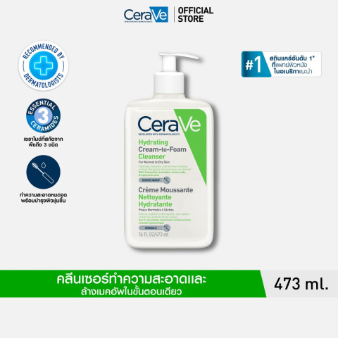 เซราวี CeraVe Hydrating Cream-to-Foam Cleanser 473ml คลีนเซอร์ล้างหน้าและล้างเครื่องสำอางในขั้นตอนเดียว เนื้อครีมอ่อนโยนที่เปลี่ยนเป็นโฟมนุ่มเมื่อสัมผัสน้ำ ช่วยทำความสะอาดสิ่งสกปรก ความมันส่วนเกิน และเมคอัพได้อย่างหมดจด โดยยังคงความชุ่มชื้น ไม่ทำร้ายเกราะปกป้องผิว เหมาะสำหรับทุกสภาพผิว รวมถึงผิวบอบบางระคายเคืองง่าย
