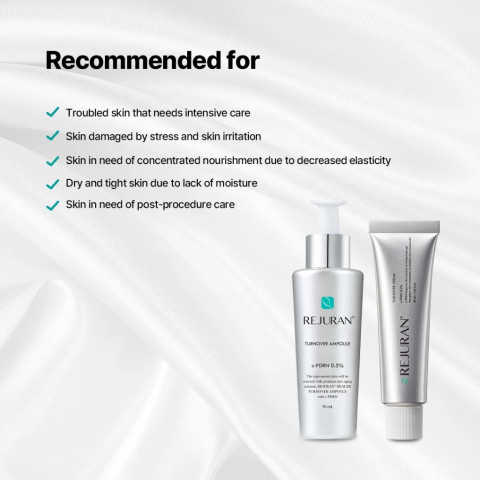 ดูโอ้ฟื้นบำรุงเข้มข้นจาก REJURAN ที่รวมพลังของ Turnover Ampoule และ Turnover Cream Enhanced เพื่อดูแลผิวที่อ่อนล้า ระคายเคืองง่าย ขาดความยืดหยุ่น หรือผิวที่ต้องการการฟื้นตัวเป็นพิเศษหลังทำทรีตเมนต์ ให้ผิวดูแข็งแรง เรียบเนียน และชุ่มชื้นขึ้นอย่างรู้สึกได้ เหมาะสำหรับ ทุกสภาพผิว