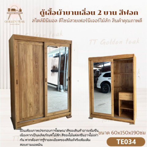 ตู้เสื้อผ้าบานเลื่อนไม้สักทอง 2 บาน สีฟอก รุ่น TE034 เฟอร์นิเจอร์ไม้สักทองผลิตเอง งานสวยสไตล์โมเดิร์น-มินิมอล ให้บรรยากาศอบอุ่นแบบธรรมชาติ เหมาะกับห้องนอนทุกโทนสี ด้วยโทน สีฟอก ที่ดูสว่าง โปร่ง และเข้ากับบ้านสมัยใหม่ได้ง่าย พร้อมบริการ ส่งฟรี + ยกติดตั้งฟรี (ยกเว้นพื้นที่ภาคใต้)