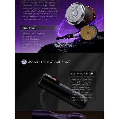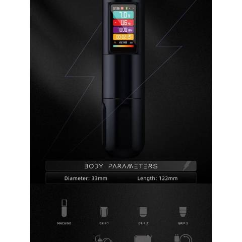 คงแรงดันไว้ที่ 9V แต่ปรับความเร็วได้ตั้งแต่ 180rpm ถึง 9000rpm (ความถี่ 3Hz–160Hz) ให้พลังคงที่แต่เลือกสปีดตามสไตล์การสักได้Free Mode