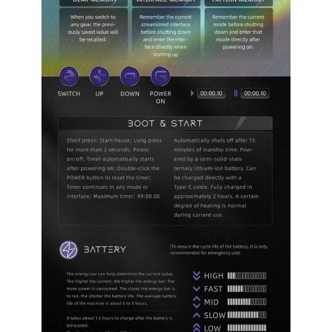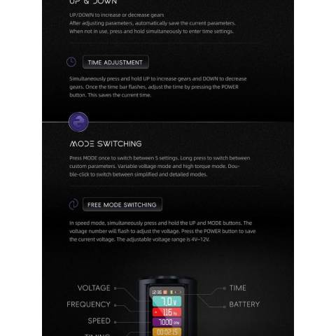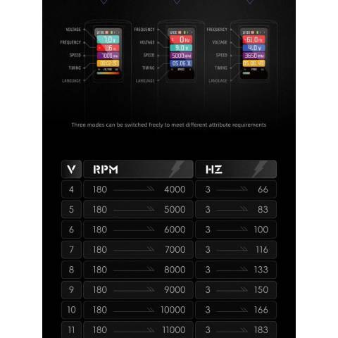 โหมดสุดยืดหยุ่น ปรับแรงดันและความเร็วแยกกันได้เพื่อเซ็ตอัปเฉพาะตัว: 4V–12V, 3Hz–150Hz และ 180rpm–12000rpm