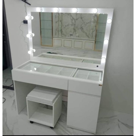 โต๊ะเครื่องแป้งมีไฟ รุ่น A ผิวเมลามีน (120/160 ซม.) ราคา 8,650.00 บาท ดีไซน์สไตล์เกาหลี โทนสีขาวเรียบหรู ช่วยให้มุมแต่งหน้าดูสว่าง โปร่ง และเป็นระเบียบยิ่งขึ้น มาพร้อมไฟส่องสว่างสำหรับแต่งหน้า และเก้าอี้สตูลในชุดเดียว ตอบโจทย์ทั้งความสวยและการใช้งานจริงด้วยช่องเก็บของหลายจุด ใส่เครื่องสำอาง สกินแคร์ และอุปกรณ์ทำผมได้จุใจ