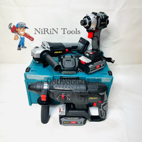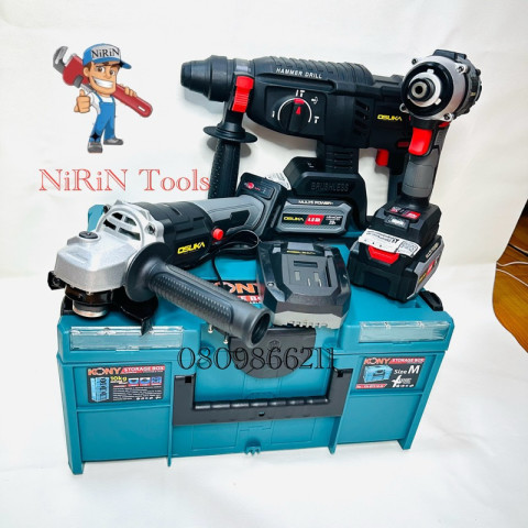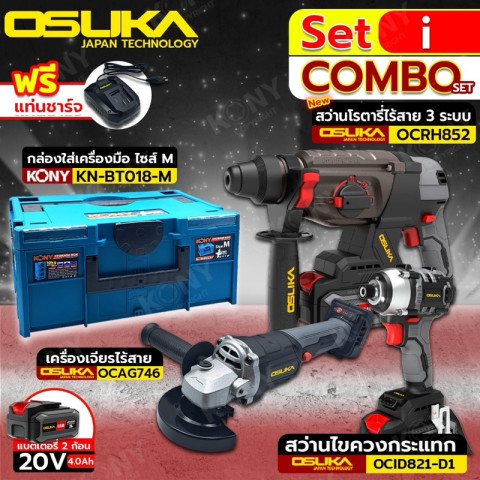 OSUKA COMBOSET ชุดสว่านโรตารี่ + สว่านไขควงกระแทก + เครื่องเจียร์ไร้สาย 20V ครบจบในชุดเดียว สำหรับงานช่างบ้าน งานติดตั้ง งานก่อสร้าง และงานซ่อมบำรุงที่ต้องการความคล่องตัวแบบไร้สาย มาพร้อมแบตเตอรี่ 20V 4.0Ah จำนวน 2 ก้อน ใช้งานสลับได้ต่อเนื่อง และจัดเก็บเป็นระเบียบด้วย กล่องเครื่องมือ KONY ไซส์ M (อุปกรณ์ทั้งหมดจัดลงกล่อง พร้อมจัดส่ง)